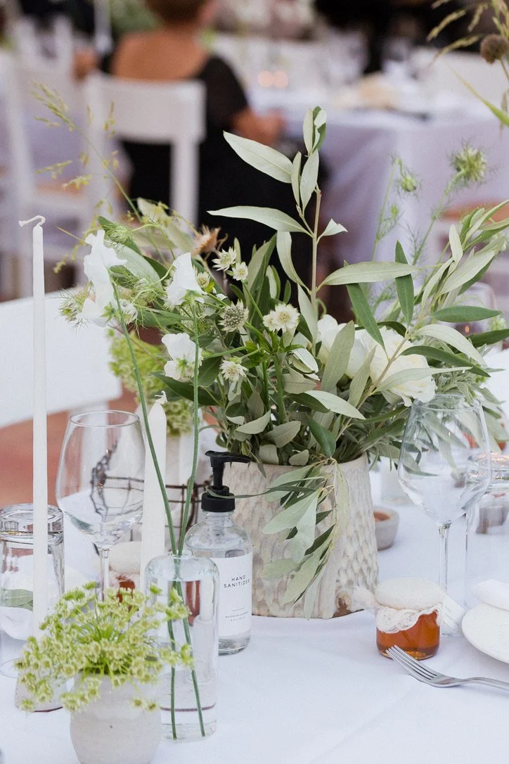 The arches of the church, covered in wild greenery and olive branches, welcomed the guests. At the reception table, the elegant tall glass pots hosted local wildflowers. They blended seamlessly with the handmade ceramic jugs of the well-known potter M. Vasiliou full of broad-leaved olive branches, wildflowers, and David Austin, white roses.