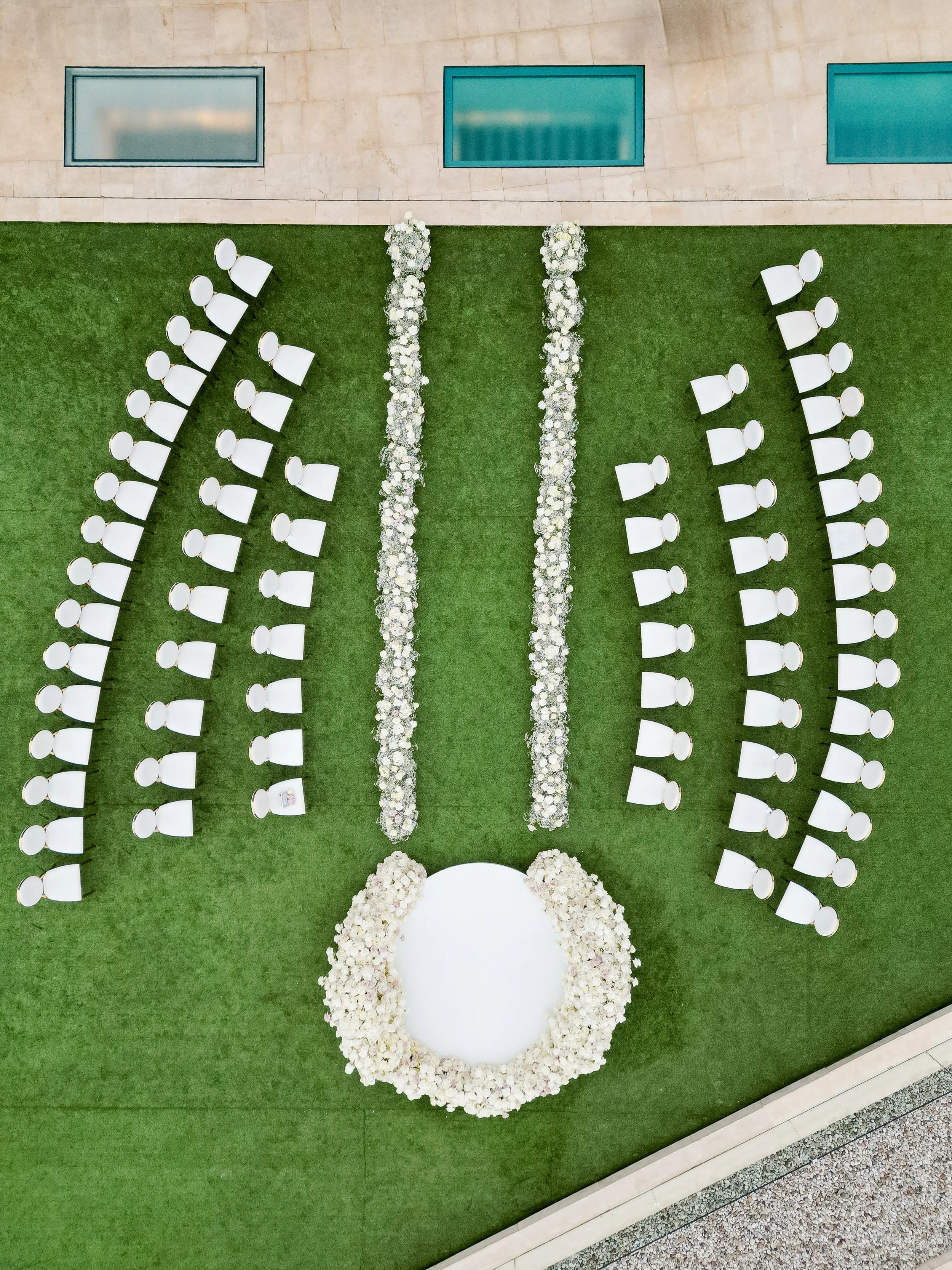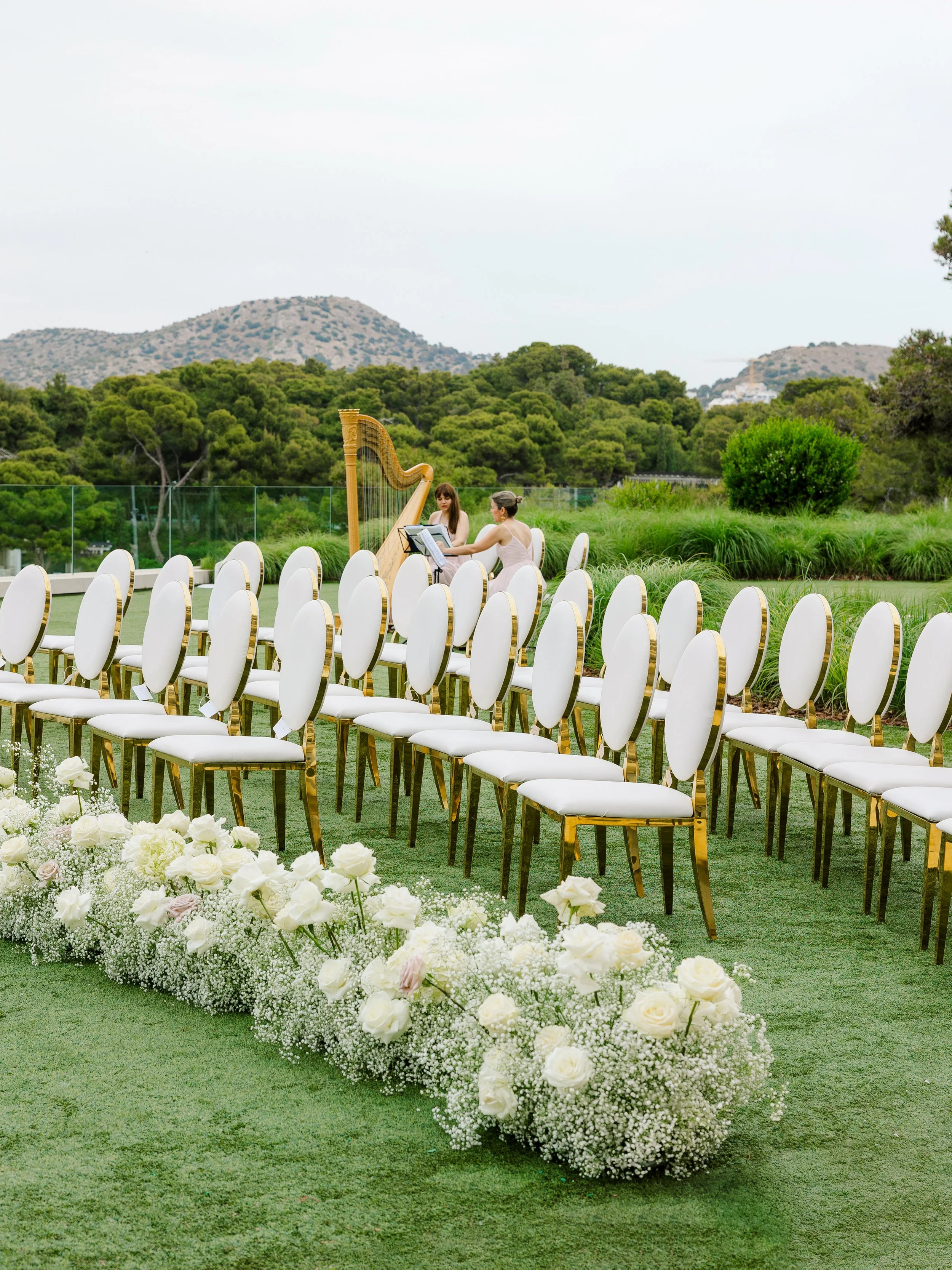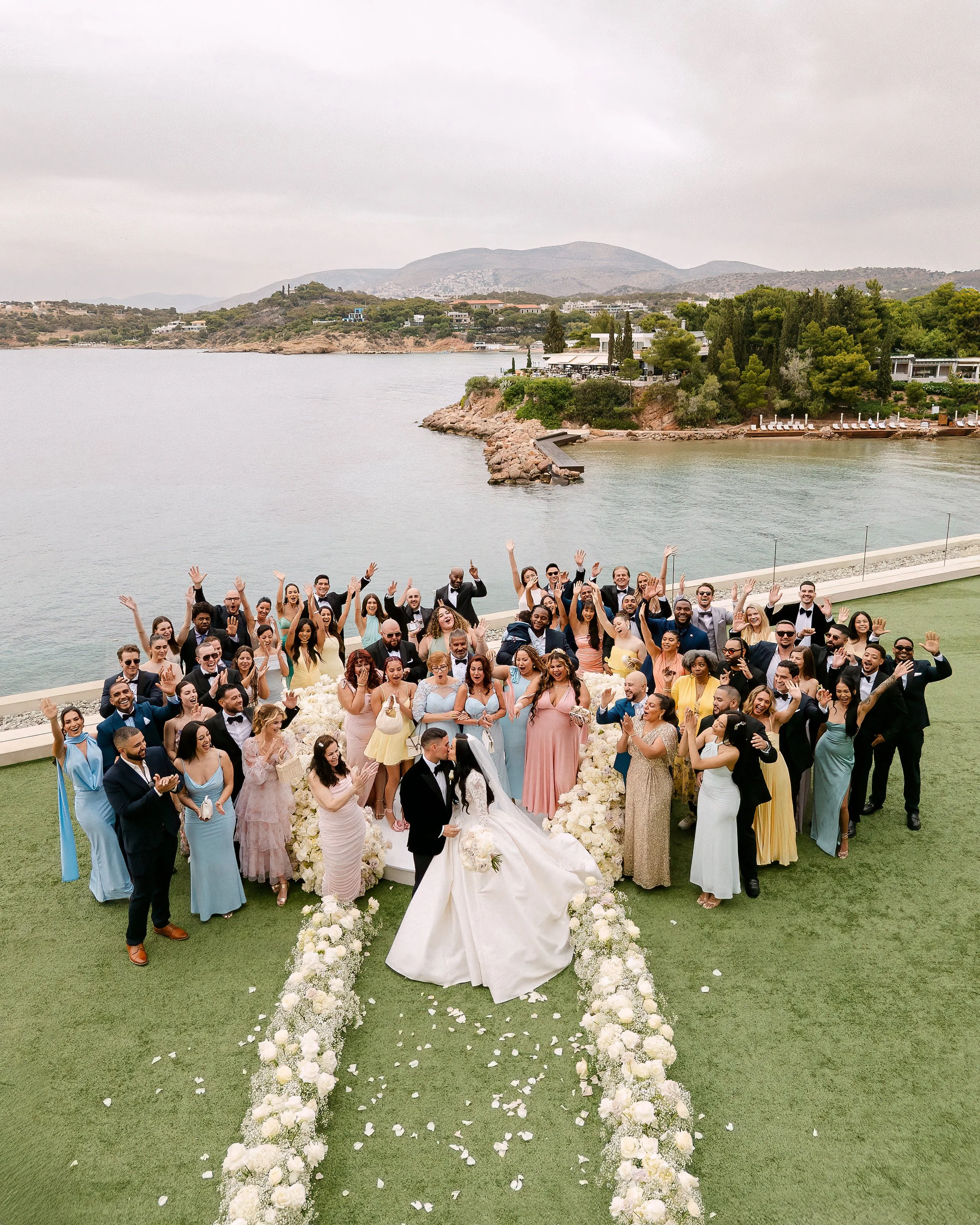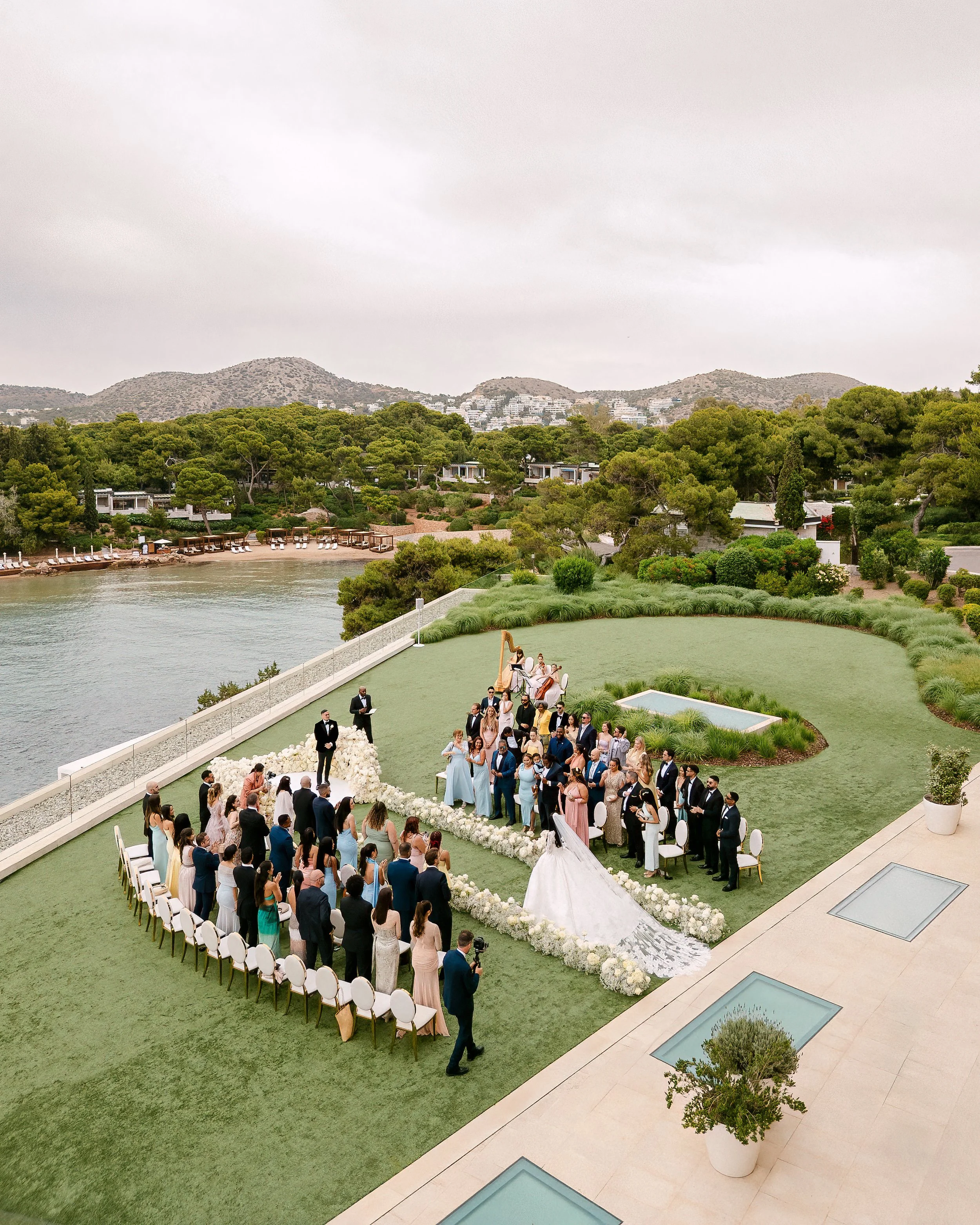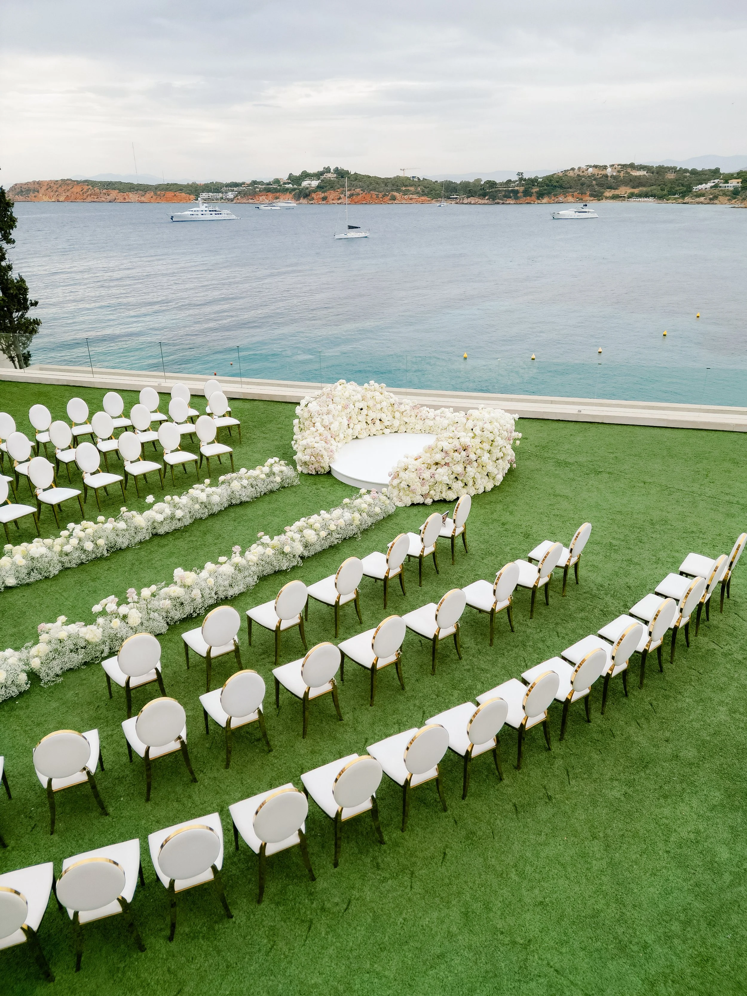 When Emily & Jeremy chose the Four Seasons Astir Palace for their wedding, they wanted a celebration that would settle into the landscape, soft, warm, and unforgettable. We brought the vision to life with florals that embraced the energy of the Athenian Riviera. For the ceremony, a circular platform faced the sea, framed by lush white arrangements that caught the gentle breeze. The horizon, dotted with anchored boats, became the natural backdrop.