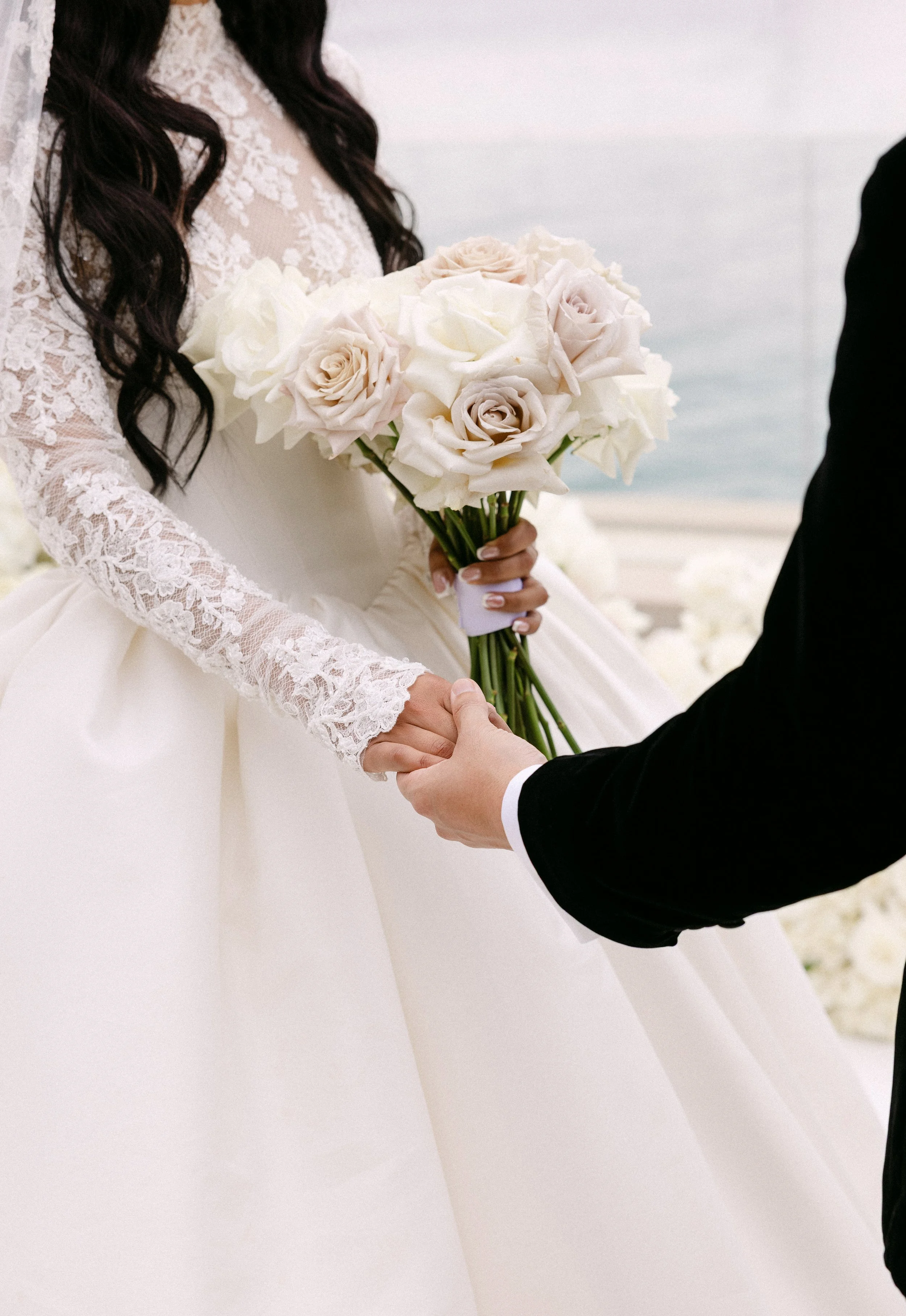 A garden pathway led toward the sea, where airy baby's breath arches created a natural tunnel. A bride in a voluminous gown and embroidered veil moved through the blooms, a moment of romance suspended in the golden hour light. The result was a celebration that felt effortless and deeply connected to its setting.