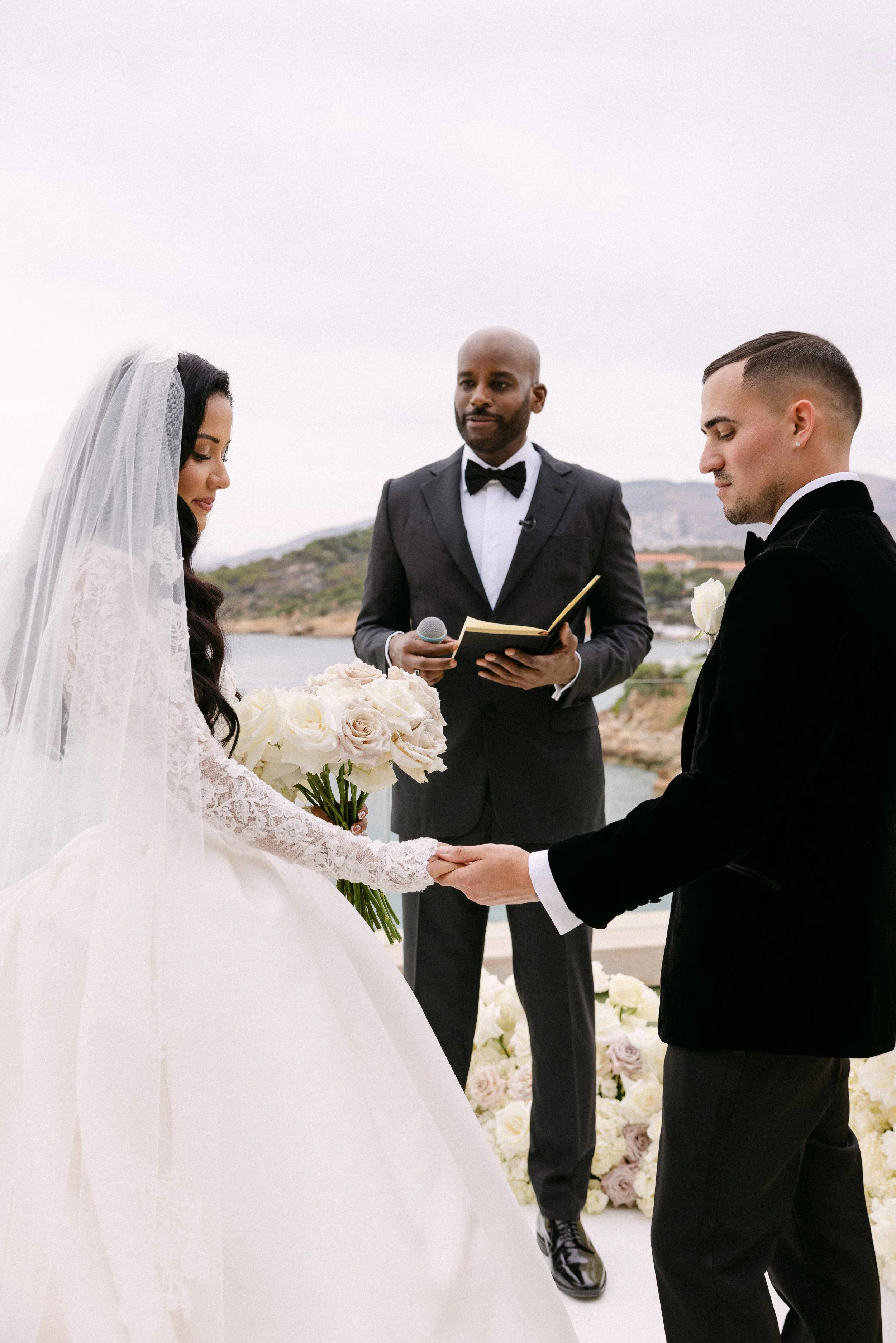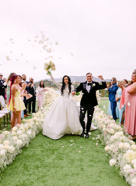 The minimalist floral design played off the raw beauty of the island, using olive branches and white roses to create something that felt both fresh and effortlessly chic. No excess, just natural elegance.