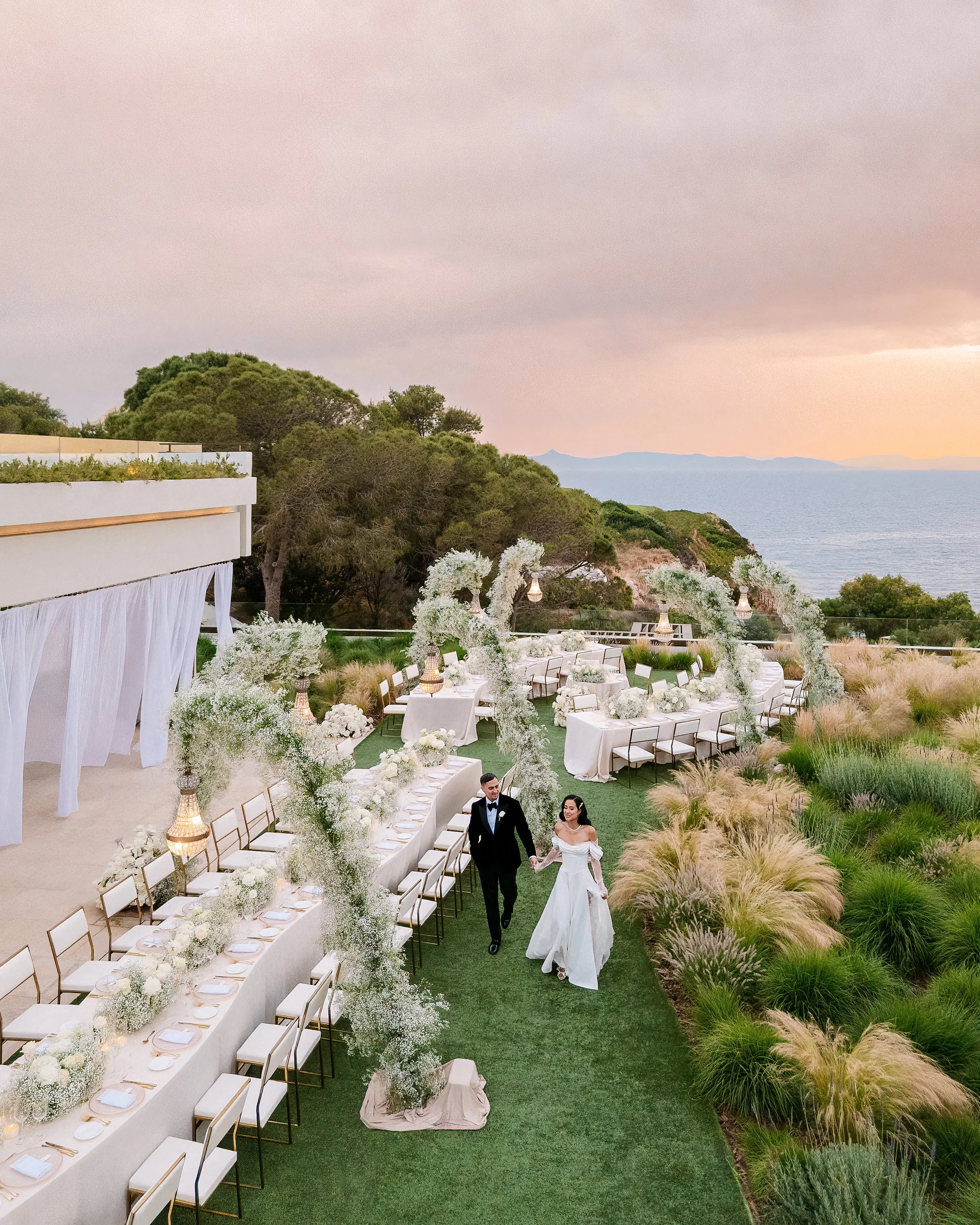 At the reception, curved banquet tables dressed in ivory curved along the terrace. Lush centerpieces of white hydrangea, phalaenopsis orchids, and delicate blooms ran the length of each table, creating an intimate, garden-like atmosphere. Above, chandeliers wrapped entirely in baby's breath glowed as the sun slipped behind the hills, casting the scene in warm rose and pink.